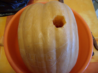Comecei por delinear a carantonha que escolhi fazer e retirei uma "tampa", no topo da abóbora: