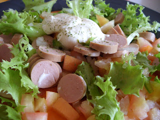 Aquecem-se as salsichas num tachinho, e cortam-se às rodelas.