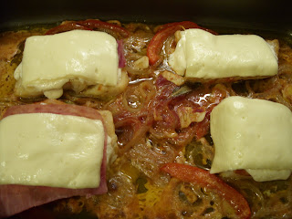Depois num tabuleiro de ir ao forno, cortei a cebola às rodelas, os alhos e o pimento em tiras.