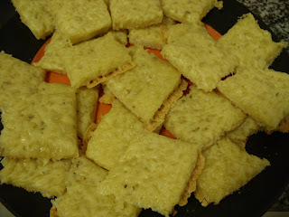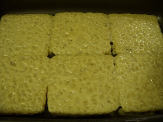 Colocam-se as fatias de pão num tabuleiro e levam-se a tostar um pouco.