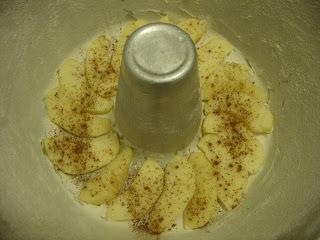 Untamos a forma, e coloca-se um maçã fatiada no fundo, com canela: