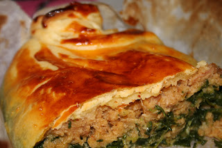 Estenda a massa folhada e coloque os espinafres e em seguida a alheira, feche a massa em forma de rebuçado ou dobrando as pontas, pincele com a gema de ovo batida e leve ao forno pré-aquecido 200º, até folhar e alourar.
